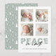 Modern julkortdesign med 4 bilder i ett rutnät med "fred" i dammig grön julmönster med skrivstil "på jorden" i svart.