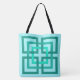 Tryckt med säcken i en modern mönster av förreglande fyrkanter, i nyans till djupa turkos/pån, på en baksida av pastellakakupa