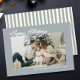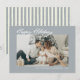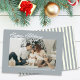 Modern dammblå semesterkort med fotolayout, perfekt för par eller familjer som söker ett personligt och elegant sätt att dela säsongshälsningar. Designen har en mjuk dammblå ram som omger ditt anpassade semesterfoto och skapar en ren och förfinad look som är perfekt för att visa upp en älskad familjeporträtt. Längst ner kan du lägga till ett personligt meddelande och år, vilket gör det enkelt att anpassa för alla familjer eller par. Baksidan av kortet visar snygga blå och vita ränder, vilket ger en elegant och sammanhängande finish. Detta neutraltonade julkort passar modern, minimalistisk smak och ger en varm och hjärtlig presentation. Perfekt för att skicka jul-, nyårs- eller vintersemesterhälsningar med en samtida, tidlös estetik, är denna design både visuellt tilltalande och mycket mångsidig för en bred målgrupp och familjestilar. Finns som tryckta kort eller direkt digital ned