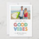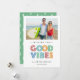 Designen har en modern färgglad "bra vibbar" med ditt favoritfoto. Vitt juldoodle-trädsmönster överlagt i grönt på bakre högtidskort.