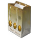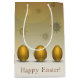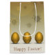 En abstrakt och modern illustration i Påsk med tre gyllene Påskägg på en bänkbakgrund med abstrakt blommor.