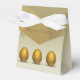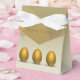 En abstrakt och modern illustration i Påsk med tre gyllene Påskägg på en bänkbakgrund med abstrakt blommor.