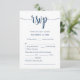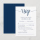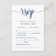 Det här är det vackra Modern, Kalligrafi, Romantiskt OSA (respondentkort), i klassblått tema, där du kan redigera, ändra färg och formatera det enligt ditt designkrav, med måltider, reserverade sittplatser, nummer som deltar och alternativ som kräver sång. #TeeshaDerrick