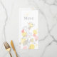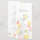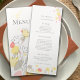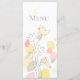 Moderna konfettiblad bröllop eller formella middagsmenyer. Dubbelsidig enkel modern linjearbetad blomma med kronbladskonfetti stil gul, orange och grå middagsmeny. Unikt ritad och designad av Sarah Trett för www.mittleedenweddings.com