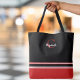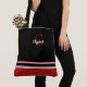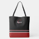 En chic, modern handväska med djärka färgblock och elegant personalisering. Denna design har skarpa svarta, röda och vita ränder i lager på en klassisk canvas-silhuett, med en dekorativ röd initial och ditt anpassade namn i vit script kalligrafi.