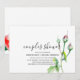 Elegant och modern vattenfärg blommig handskriven tematiskt par brud shower inbjudan i vitt med röda rosor och knoppar, gröna blad med utrymme på baksidan för ytterligare detaljer. För matchande festtillbehör kontakta designern. Du kan överföra denna design till en magnetisk inbjudan eller annan storlek, stil som önskat.