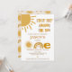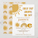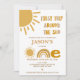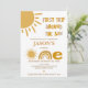 Söt modern inbjudan till ettårsfest med tema första resan runt solen, med sol, regnbåge och flerfärgad text. Denna söta sol-inspirerade inbjudan till ettårsfest är perfekt för någon som söker en modern inbjudan.