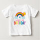 Ljus och glad födelsedagskjorta för barn med regnbågsdesign / över regnbågen festtema med moln och sol. Regnbågens färger inkluderar: röd, orange, gul, rosa, grön, turkos, blå och lila.