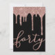Modern 40-dagars festinbjudan med ro guld glitter drops på en svart bakgrund och ''40''-skript i calligraphy lettering i trendiget ro guld. Anpassa med information om party på baksidan.