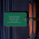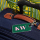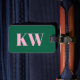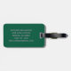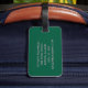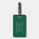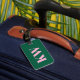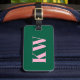 Denna resväskemärke har dina initialer och kontaktinformation i rosa på en grön bakgrund.
