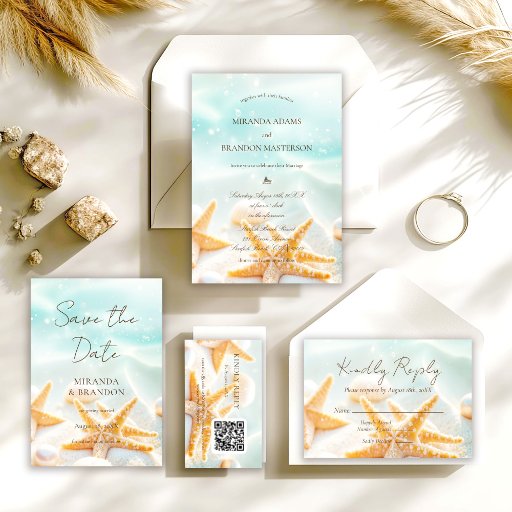 Moderna sjöstjärnskepslar QR-kod Havsstrand Bröllo Inbjudningar