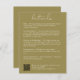 Färdigställ din svit med bröllopsinbjudningar med detta sofistikerade detaljerade inklusionskort. Med en klassisk färgkombination av olivgrönt och krämvitt kompletterar detta kort sömlöst den moderna estetiken hos era inbjudningar från vår Elegant Ampersand-kollektion. Detta inklusionskort ger gott om utrymme för att förmedla viktiga detaljer om bröllopet, såsom information om webbplats, boendealternativ och evenemangsschema. Den eleganta typografin säkerställer att all information presenteras tydligt och stilfullt.