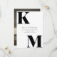 Enkel, men ändå en storslagen: Modern design för 'Spara datum' med fet typografi och monogram i svart och vitt. Minimalt elegant text på framsidan informerar dina gäster om det kommande bröllopet. Anpassad bild på baksidan. Alla färger kan anpassas för att passa din bröllopps tema om du inte vill ha svart och vitt.