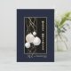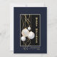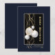 Ett sofistikerat God Jul-kort med vita och gyllene hängande band och ornament på en svart och blå bakgrund för att dela glädjen under den festliga säsongen. Anpassa dina detaljer i informationen nedanför bilden.