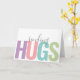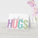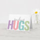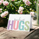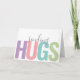 Ett enkelt modernt kort packat med vänlighet och tillgivenhet, denna design har texten "skickar kramar" i en kombination av fetstil och handskriven stil på framsidan av kortet. Den flerfärgade texten på en ren vit bakgrund bidrar till kortets moderna utseende. Texten på insidan är ett genomtänkt uttryck som kan beställas som skriven eller anpassas med din egen önskade text på insidan. Detta kort är inte bara ett bra val för speciella tillfällen som Alla hjärtans dag, det är också ett perfekt val för att skicka ett genomtänkt kort till någon som är sjuk, behöver en uppmuntran eller kanske en familjemedlem eller vän som bor ensam eller på ett äldreboende. Så många möjligheter att lysa upp någons dag med detta enkla kort.