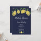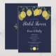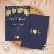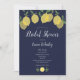 Med lemoner och grönska på en marinblå bakgrund kan denna eleganta moderna bröllops- eller parfestinbjudan anpassas med din speciella evenemangsinfo. Baksidan har initialer i monogram. Designad av Thisisnotme©