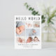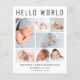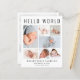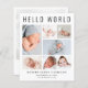 Ett elegant och prisvärt födelsetal för att presentera din nyfödda bebis för familj och vänner med "Hello World" i stora bokstäver, en 7-foto collage och deras namn, födelsedatum och födelsestatistik i modern enkel typografi. På baksidan kan du lägga till ett extra foto och ditt personliga meddelande. Detta prisvärda halvblanka papper har liknande vikt som fotopapper. En traditionell version i kartong finns också tillgänglig (skicka oss ett meddelande för länken).