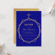 Denna eleganta dopinbjudan rekommenderas för en babypojke och har en oregelbunden guldbård med två sexhörningar i guld som överlagras på en marinblå bakgrund, med ett guldkors högst upp. Barnets namn är skrivet med en elegant kalligrafisk skrift. All text har en gyllengul färg, likt guldramen. På baksidan finns en guldbesatt textur med glitter.