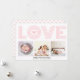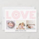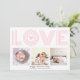 rosa, modernt KÄRLEK- och Valentines day-kort för hjärtfoto. Den har ord "KÄRLEK" i ett modernt, rastrerat teckensnitt i rosa och tre foton. Baksidan har en mönster av rosans hjärtan. Ett foto är foto av fotografi © Storytree Studios, Stanford, CA