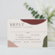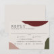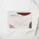 Ett konstnärligt utformat svarsbrev för bröllop som förmedlar enkel elegans, har denna design en rik höstfärgspalett i burgunder vinröd, terrakotta och jägare gröna abstrakta former längs kanterna av designen. En ecru bakgrund passar bra ihop med höstfärgerna. Teckensnittet är krispigt och elegant i sin enkelhet. Detta svarsbrev har en textmall som innehåller menyalternativ för gästerna att välja sin föredragna måltid. Du kan anpassa valen med din egen formulering samt den obligatoriska svarsfristen.