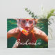 Skicka ut coola, moderna, anpassningsbara examensinbjudningar. Ersätt exempelbilden med din egen. Den trendiga vita texten i skrivstil som överlagras på fotografiet på framsidan står "Graduate". Baksidan på inbjudan är svart med ordet "celebrate" i en vit skrivstil. Ersätt den vita exempeltexten på baksidan med din examen och ditt evenemang. Anpassa den för alla typer av examen: gymnasium, universitet, forskarutbildning, juristutbildning, medicinsk utbildning eller yrkesutbildning.