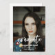 Modernt manusförsett examensmeddelande. Om så önskas kan baksidan av kortet ha text tillagd för ytterligare information om utbildning eller öppen hus-fest
