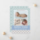 Stilfullt födelseannonskort med tre foton av din babypojke ramade av ett jade grönt och vitt quatrefoil-mönster med en "Annonserar"-rubrik. Barnets namn visas i kalligrafiskrift på en molnblå banderoll med födelseinformation och ett "Välkommen med kärlek"-meddelande nedan. En grå och vit prickaccent kompletterar botten. Alla färger och texter är helt anpassningsbara.