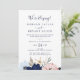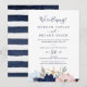 Denna moderna nautiska bröllopsinbjudan med blomsterdekor är perfekt för en kryssning eller strandfest efter vigseln. Den fantasifulla designen har rosa och marinblå akvarellblommor med guldstjärnformade dekorationer, vilket ger den en strandliknande känsla. RSVP-kort säljs separat, eller så kan du lägga till RSVP-information på baksidan av kortet.