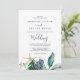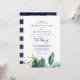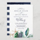 Detta moderna nautiska bröllopskort med grönska är perfekt för ett kryssnings- eller strandbröllop. Den botaniska designen har vackra gröna blad med marinblå blommor och gyllene sjöstjärneaccents, vilket ger den en strandig känsla.