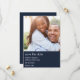 Ett enkelt modernt design för att tillkännage ditt bröllopsdatum med ett favoritfoto med en klassisk vit typografi för alla dina viktiga detaljer. Framsidan och baksidan är en djupblå färg.