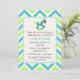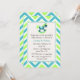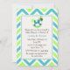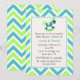 Stilfull pars baby showerinbjudan som göras i en modernt turkos, vit och ljust - grönt sparresicksackmönster. Diagram av ett vittextområde, med en turkosfärgad syr lik list, och en gullig grönt och turkos som vaggar hästen, avslutar upptill av denna underbaren tittar inbjudan. Personifiera texten för att passa dina händelsebehov. Gullig inbjudan som den ska koppla ihop cherish.