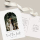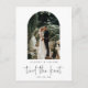 Ett modernt annonskort för att låta familj och vänner veta om ert senaste bröllop. Denna enkla annons visar er favoritbröllopsbild i en bågeform, med "knutitupp" i modern handskriven teckensnittsstil. Personifiera ytterligare med era namn och datum, och ett valfritt meddelande på baksidan.