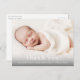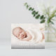 En söt fototack för födelseannonsering med modern tack och horisontellt foto utan ram. Baksidan är ett postkort med personligt meddelande från familjen.