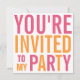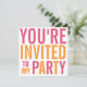 Det här är en roligt födelsedagsfest inbjudan för flickor i alla åldrar! Öga hämtar skarp rosa och orange färgad fet text. På baksidan finns några anpassningsbara fält för party-information och osa i adress i matchande färger. Visas som sömn över eller slumpar party. Perfekt för pretonar, interpoleringar och tonåringar.