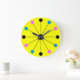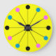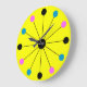 En retroväggklocka med atomårshastighet på 1950-talet, med svarta skämt och cirklar i teal, rosa och svart, inga siffror på gultens bakgrund. För vintagens tema rum, sovrum eller rymdskepp.