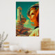 "Modiga nydagen" har en återuturistisk utformning som skildrar en porträtt av en rödhårig kvinna som granskar Nevadas landskap. - Teckning-styrelsen