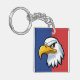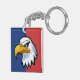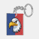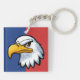 Denna nyckelring har en beslutsam seriefigur stilad örn huvuddesign mot en livfull blå och röd bakgrund.
