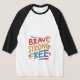 Den här t-shirt-designen har ett kraftfullt budskap om mod, styrka och frihet som visas i ett dynamiskt spektrum av färg. "Modig" kan vara ett djärvt och självsäkert färg, kanske en härlig röd eller en ljus orange. "Strong" kan presenteras i ett bestämt och pålitligt färg, t.ex. en blåblå eller fast grönt. Slutligen kan "Fri" visas i en ljus och upplyftande nyans, som en ljus gult eller en tydlig blåblå himlar. Texten ordnas på ett synligt slående sätt, eventuellt staplat lodrätt eller sammanvävd för ett dynamiskt utseende. Denna utformning är en perfekt för dem som vill fira sin inre styrka och ta till sig ett frihetens liv.