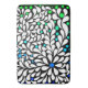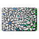 Blommor och snurrande vita petaler mot en fet svart bakgrund. Originalfärgning av digitalt material. Crisp kant, vassa linjer och vita prickar och snurrande petaler. Blå teal färg tonar ut blomcentrum...