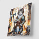 En katt som är klädd i medeltida pansar står stolt med en yxa i ett slott insida, belyst med en varm glöd från ett stenfönster.
