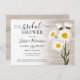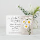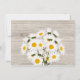 Rustic wood land daisy blommor möhippa inbjudan med söt handmålade vita blommor och orange blommor på ett ljust brunt, grått-trä med vitt överlägg, handskrivet manustypografi och en blommigt bouquet-bunt på baksidan.