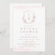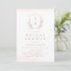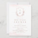 Faux ro guld och rosa minimalist inbjudningskort för möhippan, med ditt monogrammade initialer inramat av elegant vapensköld och hand illustrerade botaniska löv överst. Din händelseinformation visas nedan i modernt skript och klassiskt teckensnitt. Enkel och lyx. Visa alla matchande biet i samlingen