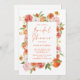 Citrusfrukter i temat inbjudningskort för möhippan med en vattenfärgad blommigt ram med blommor, orangar och citrusskivor av rosa, vit och orange.