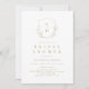 faux guld och vit minimalistisk inbjudningskort för möhippan, med ditt monogrammade initialer inramat med elegantens vapensköld och handillustrerat botaniskt löv överst. Din händelseinformation visas nedan i modernt skript och klassiskt teckensnitt. Enkel och lyx. Visa alla matchande delar i samlingen