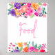 En fetstilt rosa Garden bright blommigt vattencolor möhippa food-symbol med handmålad rosa, rött, lila, orange blommor och grönt eukalyptus-löv och grönt-blad med ett modernt skript-penselteckensnitt.