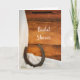 Inbjudan gäster med det charmerande bosshoe- och vitsiga hälsningskortet Land Inbjudningskort för möhippan. Denna informella men elegant westerna ranch stil anpassningsbar equine möhippa inbjudan uppvisar ett digitalt förbättrat quaint foto av ett rostbildande hästskoe och vit satin med en avvanda brunlingstall.