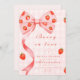 En söt och lekfull möhippa med en rosa gingham-bakgrund, juicy jordgubbe och en överdimensionerad ribbonbåge. Perfekt för en brud som kärlek feminin, Y2K eller kokvettetik. Idealisk för en sommardusch på Malibu eller ett viskigt firande med en fruktig tvist.
