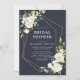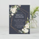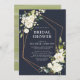 Vackra och elegant, denna moderna marmorerade vita blommigt inbjudningskort för möhippan i ro, av koppar, har en härlig geometri för faux-folie i ro, försedd med vackra handmålade vattenfärgade blommigtar och grön i vita och grädda nyanser, i modern marin blå bakgrund. Kortets baksida har en grönt som färgats vattenfärgen struktur. Copyright Elegant Inbjudan, alla höger reserverade.