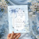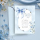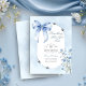 Söt inbjudningskort för möhippan för temat "Nåt blått före mig". Söt och delikat. Utformningen har en blå båge och en skarp blå blomma på en tvätta av pastellvattenfärg. "Något blått före mig" är skrivet i elegantens typografi och alla inbjudningsformuleringar passar ihop med ett modernt ovalt ram. Bläddra i min "Någonting Blue Möhippa Collection" om du vill ha alternativa utformningar.