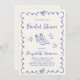 Retroinspirerad, lätt grädde inbjudningskort för möhippan med fransk blå vågigt ram gräns, visuella illustrationer av hand plockade med hjärtan och högklackade skor av möhippa med coquette-skor, och "Möhippa" och bridens namn i ett roligt, lekfullt blått skript.